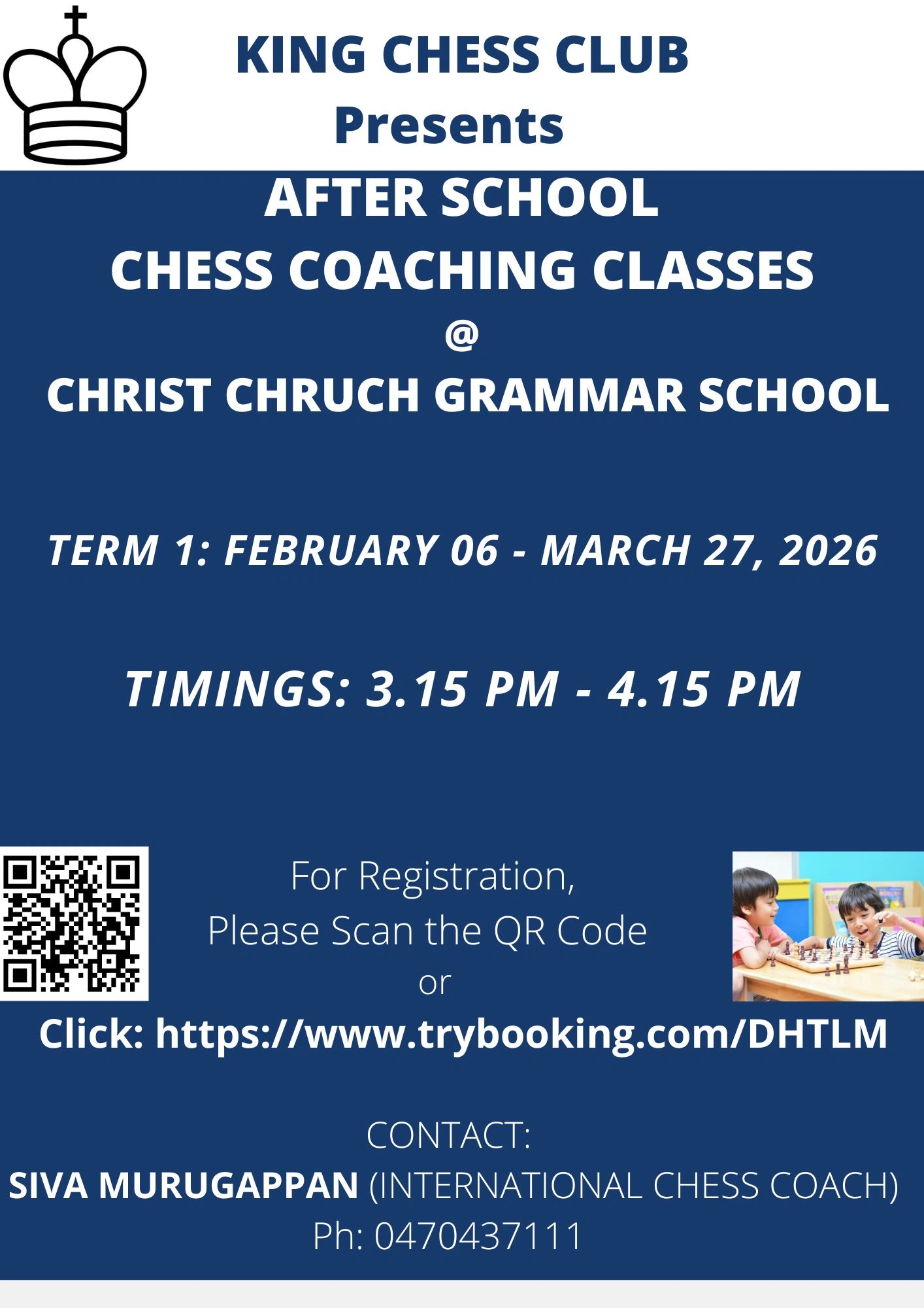 This Chess club will commence at the Christ Church Grammar School on the 06th of February 2026(TERM 1,2026 classes) and continue every Friday until MARCH 27th, 2026. This Chess Club is run by the head coach Siva Murugappan.