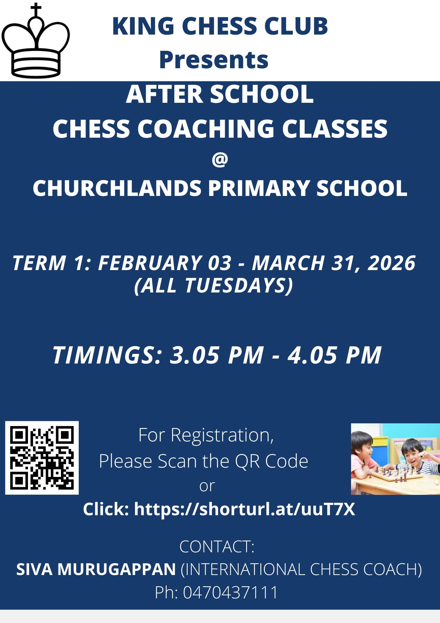 This Chess club will commence at the Churchlands Primary School on the 03rd of FEBRUARY 2026(TERM 1,2026 classes) and continuing every Tuesday until MARCH 31st 2026. This Chess Club is run by the head coach Siva Murugappan.