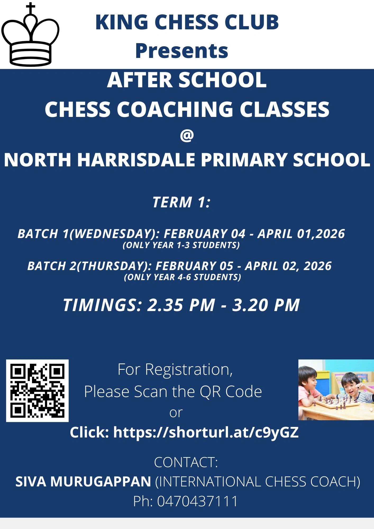 This Chess club will commence at the North Harrisdale Primary School on the 04th of FEBRUARY 2026 (TERM 1 ,2026 classes) and continuing every Wednesday and Thursday until APRIL 02nd 2026. This Chess Club is run by the head coach Siva Murugappan.